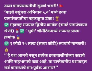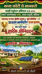 माझी वसूधरा 5.0 हे अभियान 1 जून 2024 ते 31 मार्च 2025 या कालावधीत राबविण्यात आले. राज्यातील 27895 ग्रामपंचायतींनी या अभियानात भाग घेतला. पृथ्वी, वायू, जल, अग्नी आणि आकाश या निसर्गाशी संबधित पंचतत्वांवर आधारीत हे अभियान असून 2 ऑक्टोबर 2020 पासून या अभियानाला सुरवात करण्यात आली आहे. पंचतत्वावर आधारीत या अभियानांतर्गत डेस्कटॉप आणि फिल्ड मुल्यमापनावर त्रयस्त संस्थेमार्फत गुणांकण करण्यात आले. तीन हजार ते पाच हजार लोकसंख्या गटात डव्वा ग्रामपंचायतीने राज्यस्तरीय दुसरे पुरस्कार प्राप्त केले. त्यासाठी 75 लक्ष रुपयांचा पुस्कार शासनाने जाहिर केला आहे. सोबतच भूमि थीमॅटीक मधील उच्चतम कामगीरीसाठी सुध्दा डव्वा ग्रामपंचायतीला पुरस्कृत करण्यात आले असून त्यासाठी शासनाने 50 लक्ष रूपयांचा पुरस्कार जाहिर केला आहे. दीड हजार ते 2 हजार लोकसंख्या गटात भजियापार ग्रामपंचायतीने राज्यस्तरीय दुसरे पुरस्कार प्राप्त केले. त्यासाठी 75 लक्ष रुपयांचा पुरस्कार तर भूमि थीमॅटीक मधील उच्चतम कामगीरीसाठी भजियापार ग्रामपंचायतीला 50 लक्ष रूपयांचा पुरस्कार शासनाने जाहिर केला आहे. उल्लेखनीय म्हणजे, दोन्ही ग्रामपंचायतींना दोन वेगवेगळया गटात चार पुरस्कार प्राप्त झाले असून त्यांना प्रत्येकी एकूण एक कोटी 25 लक्ष रूपयांचा पुरस्कार मिळणार आहे. दोन हजार ते तीन हजार लोकसंख्या गटात नागपूर विभागातून सालेकसा पंचायत समिती अंतर्गत नानव्हा ग्रामपंचायतीला तर दीड हजार ते दोन हजार लोकसंख्या गटात नागपूर विभागातून अर्जुनी मोरगाव पंचायत समिती अंतर्गत सिरेगाव ग्रामपंचायत प्रथम ठरली असून त्यांना अनुक्रमे प्रत्येकी 50 लक्ष रूपयांचे पुरस्कार जाहीर झालेले आहेत. विशेष म्हणजे, गोंदिया जिल्हा परिषदे अंतर्गत येणाऱ्या ग्रामपंचायतींना विविध गटात एकूण सहा पुरस्कार प्राप्त झाले आहेत. उल्लेखनीय म्हणजे, शासनाने विभागस्तरीय सर्वोत्तम कामगिरी करण्यासाठी मुख्य कार्यकारी अधिकारी यांना देखील पुरस्कृत केले आहे. यात विभागस्तरातून गोंदिया जिल्हा परिषदेचे मुख्य कार्यकारी अधिकारी मा. श्री. एम. मुरूगानंथम यांना विभागस्तरीय सर्वोत्तम कामगीरीसाठी पुरस्कृत करण्यात आले. तर जिल्हयात सर्वोत्तम कामगीरीसाठी सालेकसा पंचायत समितीचे गटविकास अधिकारी संजय पूरी यांना सुध्दा पुरस्कृत करण्यात आले. उल्लेखनीय म्हणजे, माझी वसुंधरा अभियानात आतापर्यंत गोंदिया जिल्हयात पहिल्यांदा ग्रामपंचायतस्तरावर एकूण सहा आणि वैयक्तीक कार्यासाठी दोन असे एकूण आठ पुरस्कार मिळाले. त्यामुळे गोंदिया जिल्हा परिषदेच्या नावलौकीक वाढला असून ग्रामपंचायतींना पुरस्कर मिळविण्यासाठी मुख्य कार्यकारी अधिकारी मा. श्री. एम. मुरूगनंथम यांच्या मार्गदर्शनात उप