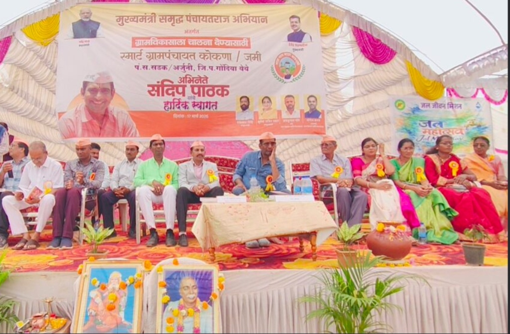 गोंदिया(अनिल मुनिश्वर):——————————————————- जिल्हा परिषद गोंदिया यांच्या वतीने राबविण्यात येत असलेल्या मुख्यमंत्री समृद्ध पंचायतराज अभियानांतर्गत सडक अर्जुनी तालुक्यातील स्मार्ट ग्रामपंचायत कोकणा जमी.येथे ग्रामविकासाला चालना देण्यासाठी विशेष कार्यक्रमाचे आयोजन करण्यात आले होते. या कार्यक्रमाला मराठी चित्रपटसृष्टीतील अभिनेते संदीप पाठक यांनी सदिच्छा भेट दिली. त्यांच्या आगमनावेळी ग्रामस्थांनी जल्लोषात स्वागत करत पुष्पगुच्छ देऊन सत्कार केला. महिलांनी लेझीमच्या तालावर आकर्षक नृत्य सादर केले तर ग्रामस्थांनी पुष्पवृष्टी करून कार्यक्रमाचे वातावरण उत्साहपूर्ण केले.