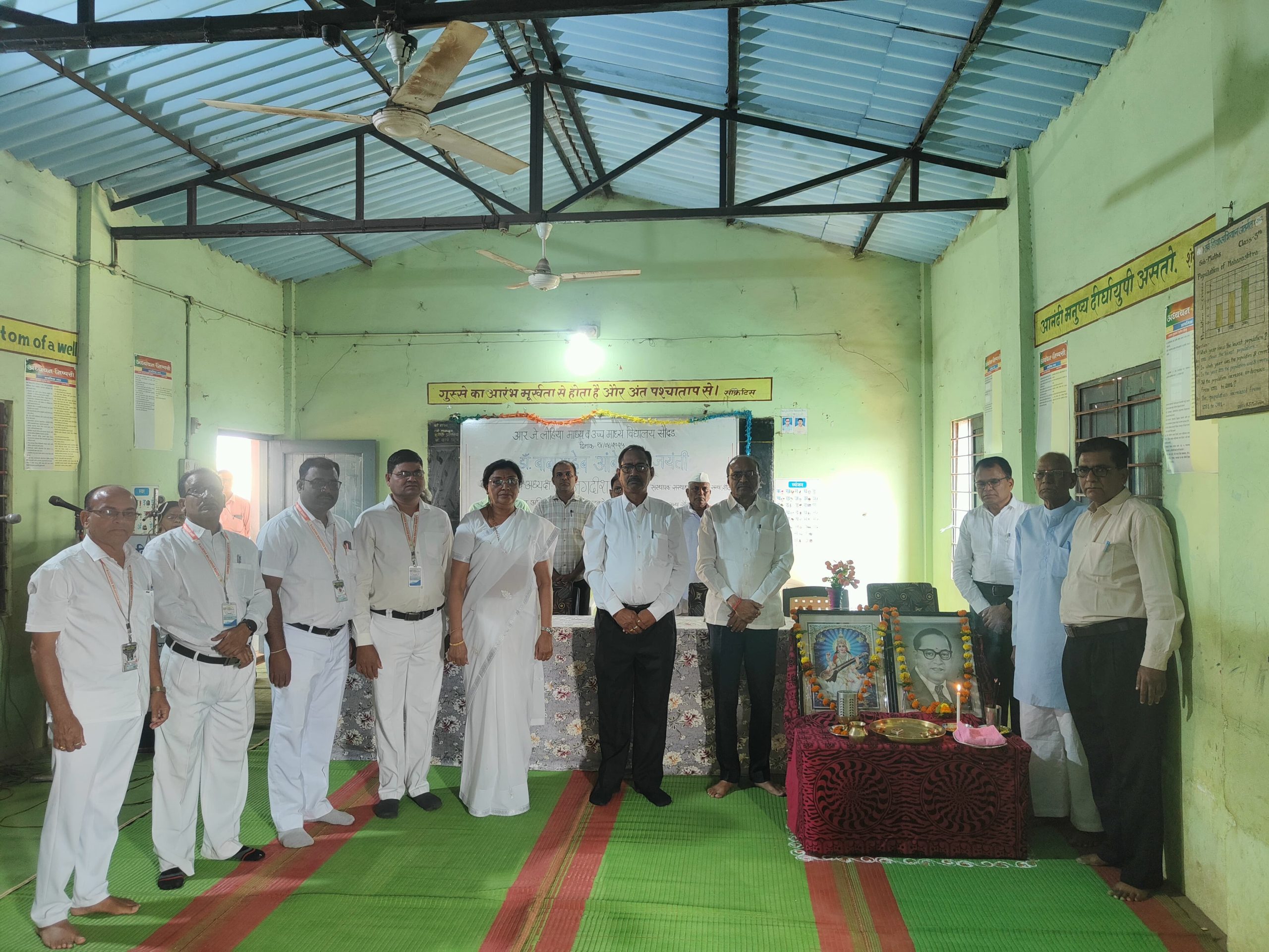 यावेळी मा. अध्यक्षांनी शाळेसमोरील संविधान चौकातील डॉ. बाबासाहेब आंबेडकर यांच्या पूर्णाकृती पुतळ्याचे पूजन करून माल्यार्पण केले तसेच विद्यालयात माता सरस्वतीच्या व डॉ. बाबासाहेब आंबेडकर यांच्या प्रतिमेचे पूजन करून माल्यार्पण केले. यावेळी प्रमुख अतिथी म्हणून मा. आ.न. घाटबांधे, उपाध्यक्ष लो.शि.संस्था, मा. थेर सर , सेवानिवृत्त गटशिक्षणाधिकारी , मा.एम. एन अग्रवाल, सेवानिवृत्त प्राचार्य ,मा.अनिल मेश्राम, से.नि.प्राचार्य , मा.समिम अहमद सय्यद ,मा. चरण शहारे, मा.महादेव लाडे, मा-पुरुषोत्तम लांजेवार, मा .पुरुषोत्तम भिवगडे, मा.हसन भांडारकर, प्राचार्या मा. उमा बाच्छल , प्राचार्य ,मा.गुलाबचंद चिखलोंडे मुख्याध्यापक मा एम. के. शिंदे ,पर्यवेक्षक मा.डी. एस.टेंभुर्णे , प्राध्यापक मा. आर .एन. अग्रवाल, आदी उपस्थित होते.