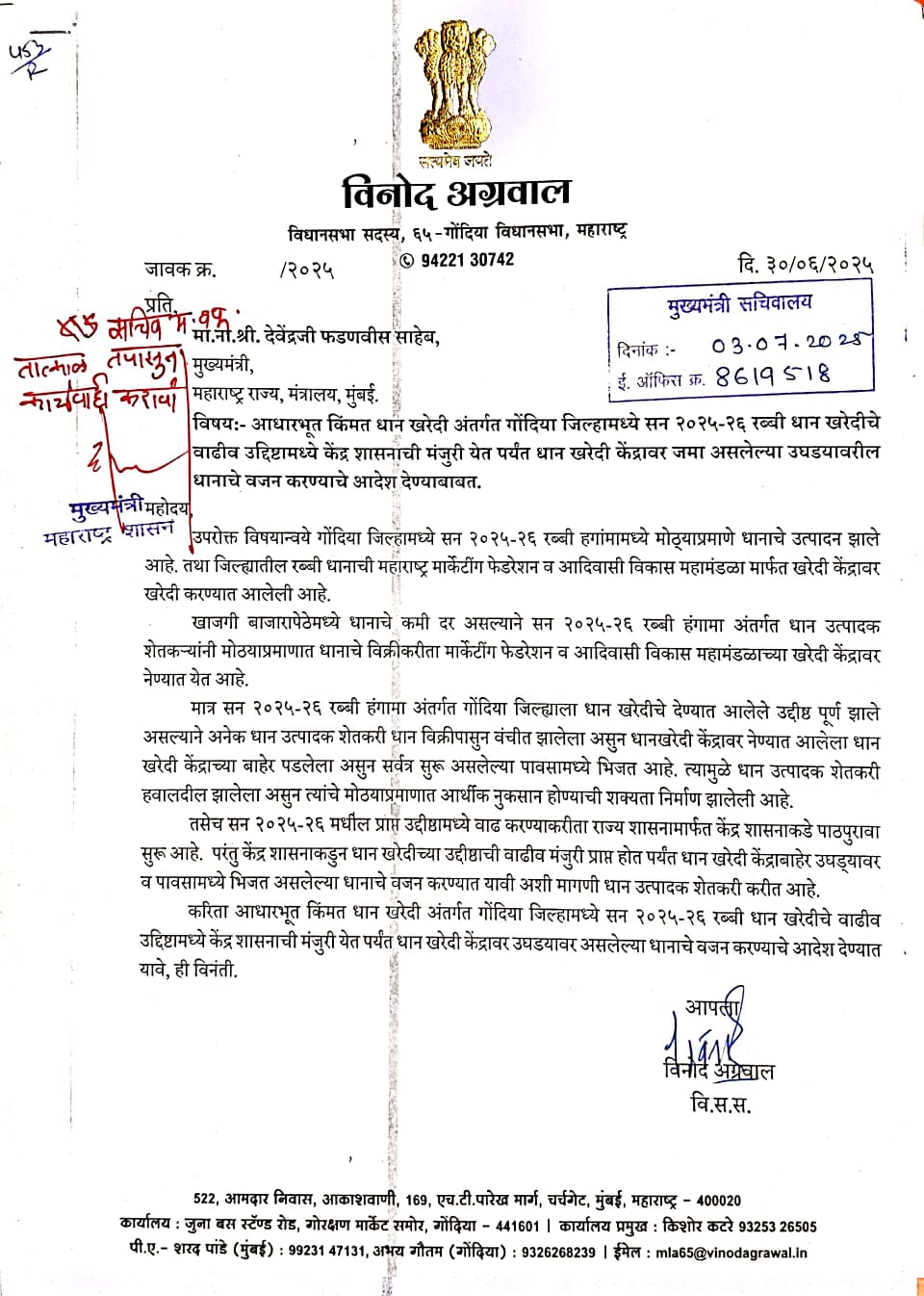 आज मुख्यमंत्री देवेंद्र फडणवीस यांनी आमदार विनोद अग्रवाल यांच्या या मागणीचा विचार करून शेतकऱ्यांच्या हितासाठी रब्बी हंगामाच्या भात खरेदीचे उद्दिष्ट वाढवण्यास मान्यता दिली आहे. लवकरच यासंदर्भातील आदेशपत्र जिल्ह्याला प्राप्त होईल.